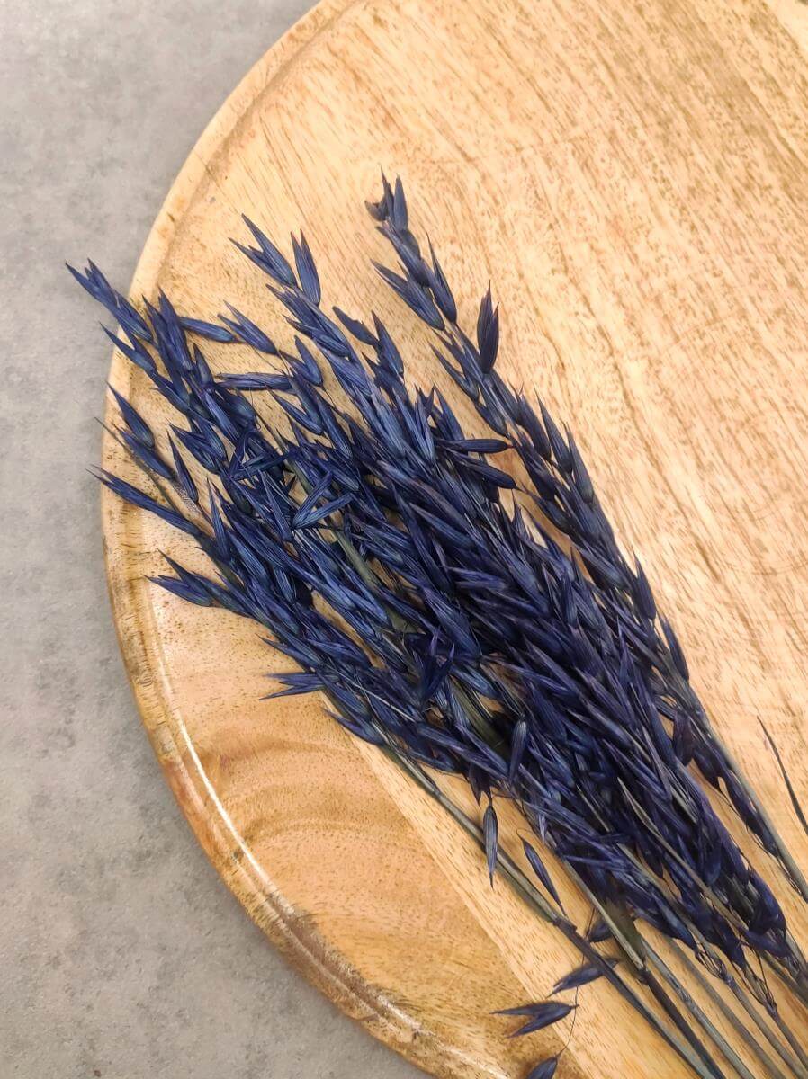 Der Hafer ist als Beiwerk in Kränzen oder Sträußen nicht mehr weg zu denken. Durch ein Trocknungsverfahren und das anschließende Einfärben in Blau ist er aber auch als Solokomponist ein echter Hingucker in jedem Trockenblumen-Arrangement.